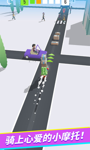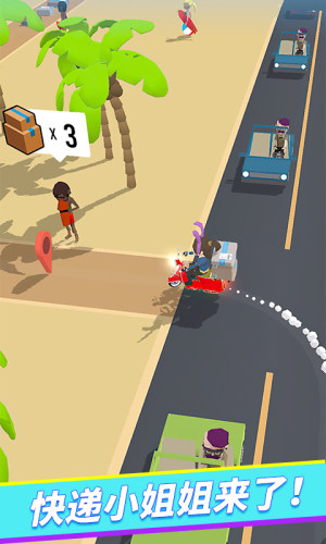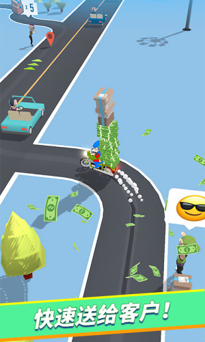 这是一款模拟快递小哥送快递并且通过自己努力收货金钱的游戏。每个关卡都有不同的挑战,不管是行人,汽车还是火车,你都需要让行哦,心急吃不了热豆腐。安全的把快件送到客户手中就可以拿到你的报酬啦!快来下载体验吧!