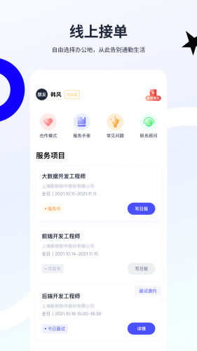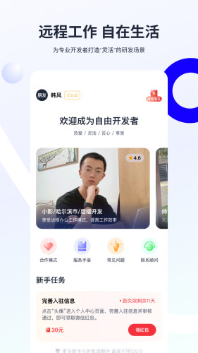 天天数链开发者app,远程工作生活平台,享受便捷服务,灵活用工,高效工作,丰富订单尽在其中,线上沟通、接单、结算,灵活用工更便捷。