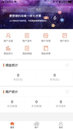 面向臻POS产品的代理商业务员,支持移动化商户业务管理能力,其中包括商户注册,以及支付、开票、接单等增值业务的开通和管理。