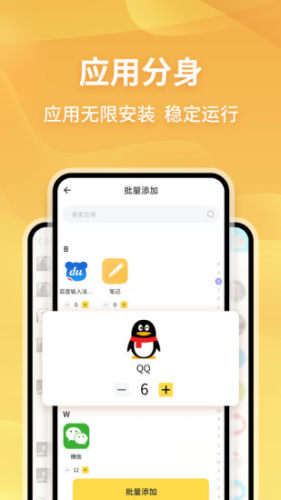 无限分身app,安全稳定的应用分身软件,轻松实现应用多开,同时登陆多个账号,为用户带来更便捷的应用多开服务,还具备机型模拟、应用隐藏功能,满足用户使用需求。