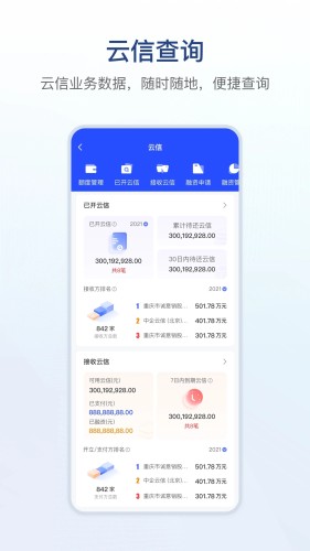 【云信】云信业务数据,云信开立、接收、融资等数据,链信端可视化呈现,便捷查询;