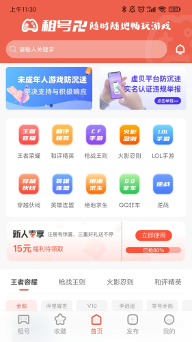 租号卍是一款专业游戏账号租赁租号玩平台,本平台汇集王者荣耀、和平精英、绝地求生、CF、LOL手游端游等上万款热门游戏账号的租赁,同时也能提供账号的发布路径,自己做号主。给玩家和号主们一个方便快捷游戏体验平台。