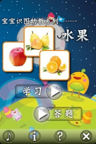分为学习模式和挑战模式两种,在学习模式下学习认识水果,在答题模式下考验自己学的如何;