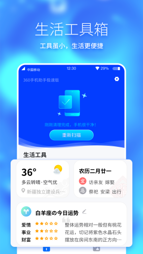 360手机助手极速版app,简单实用的手机工具,支持垃圾清理、壁纸美化、天气查询、黄历查询等功能,多种实用小工具免费用,一键清理垃圾,加快手机运行速度。