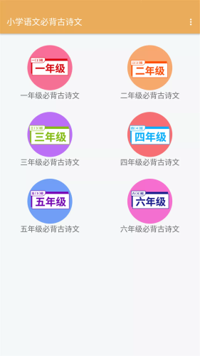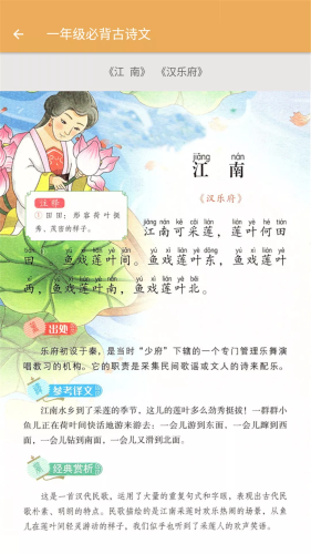 一年级到六年级必备的古诗文都有,都是课本里的古诗文,轻松学课本里的古诗词。古诗文有出处及详细的参考译文,还有拼音的标注,帮助孩子轻松掌握古诗词。学生可以选择自己的年级段需要学习的古诗词,在线学习,轻松掌握该年级所有的古诗词。