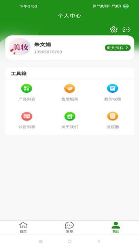 app我的页面:展示了用户基本信息,提供了设置页面入口(修改密码等操作),同时提供了对应的工具箱功能点;