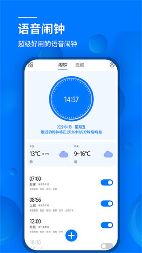 语音闹钟app是一款十分实用的语音闹钟软件。用户可以在这里随时随地进行语音闹钟设置,按时提醒用户,让用户不再迟到,非常的方便,用户还能自定义播报内容,独特播报更有趣。