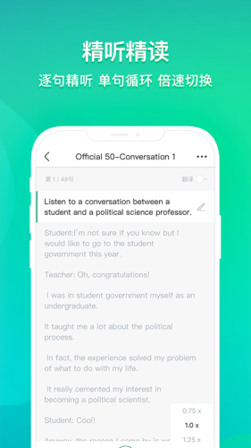 2、选择收听练习时可以自主的选择播放的倍速的方式更加的独特有趣;