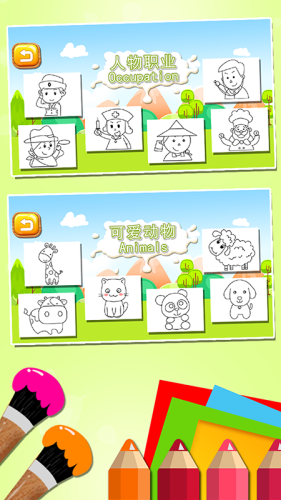 填色世界:通过让小朋友在颜色板上自行配色涂画、填色,增加孩子对颜色的认知,识别不同的色彩的不同用处的同时学习上色、调色。