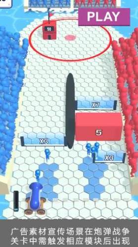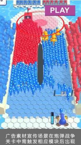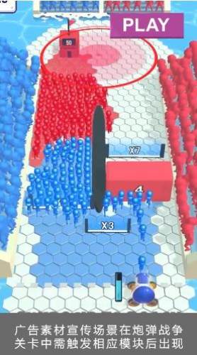 受到不同关卡中倍增门槛位置的不同,玩家需要不停的移动火炮到指定位置进行发射,来达成火柴人角色成本增长。