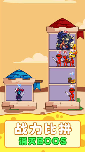 打不赢我吧,城堡激战游戏。游戏非常有趣,操控你的勇士登上城堡,解锁更多的道具装备,激战怪物,拯救公主,不同楼层怪物不同,合理分配你的战力吧。