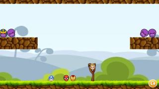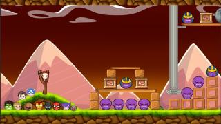 3、将弹弓上的超级英雄弹射出去,砸到紫色的灭霸,砸到全部灭霸就能通关;