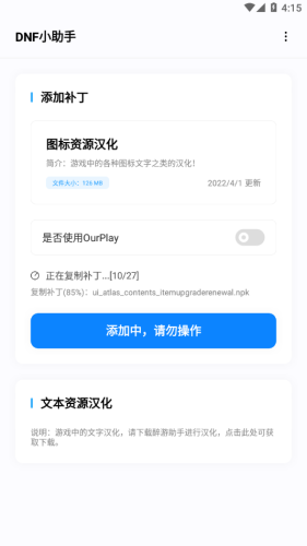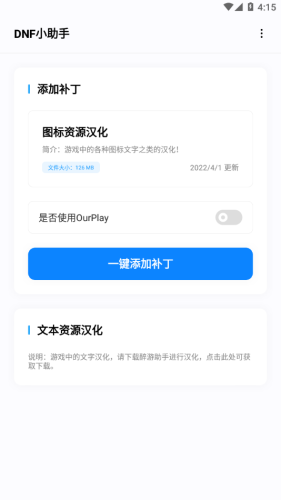DNF小助手,是地下城与勇士手游韩服版的汉化工具,提供了DNF韩服手游图标资源汉化补丁,提供了OurPlay加速功能,以及醉游助手文本资讯汉化工具等。