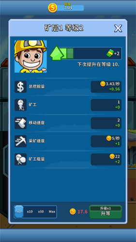 5、可以通过花费金币的方式提升自己的旷工等级,提升等级后可以获得更高的属性加成,挖掘更加快速。