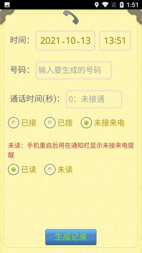 2、通话记录生成器app使用该软件,可以直接生成任意指定号码的通话记录;