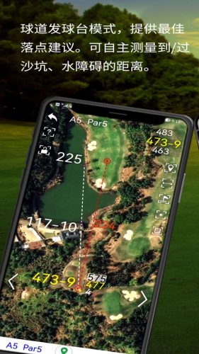 可自动给出落球区球道宽度,到/过沙坑距离,到/过水障碍距离,到/过果岭距离等。提供清晰、详尽的球道地形、地貌实景图。