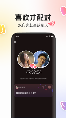 【更高效】互相喜欢即可配对聊天,双向奔赴拒绝骚扰;倒计时模式让聊天更高效。