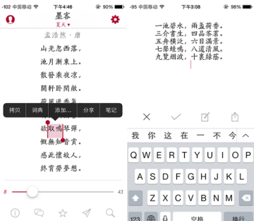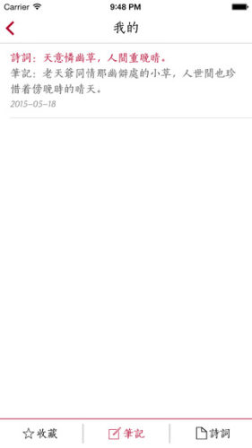 在诗词界面长按选中文字之后,还可以进行拷贝、词典、添加用户词典、分享和笔记这几种快捷功能的操作。收藏的诗词和笔记内容点击左上角图标进入个人主页中即可查看,而且在这里我们还可以创作属于自己的诗词,写完之后可以发送给朋友或分享到社交平台,自动生成图片很好地将字体展现出来,读来典雅优美。