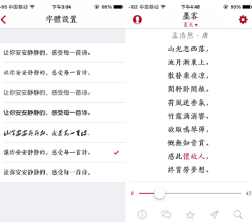 墨客 Pro 采用了素白和品红两种主题颜色,搭配 7 款不同风格且大小可调的字体,让它彰显出非常富有古典神韵的独特气质。诗词界面简单素雅,功能性却并未缺失,下方几个功能按钮错落有致,我们可以在这里看到关于作者的详细介绍及相关诗篇、查看其他用户的评论、将诗词添加收藏夹、分享到其他平台和查找想要的诗词。