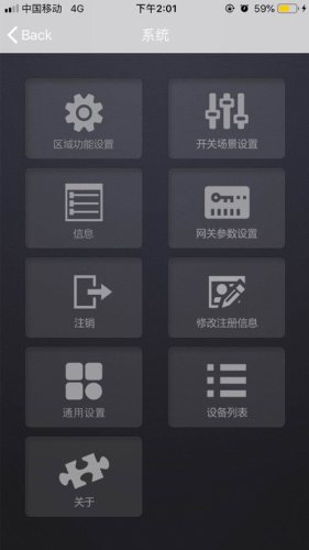 系统设置功能,包含账户设置,功能设置,配置备份,网关配置,开关场景,关于我们等功能