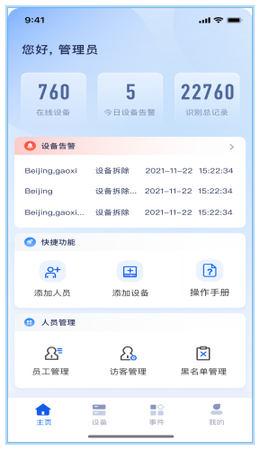 支持添加设备、添加人员、查看人员信息、查看设备识别记录等功能。