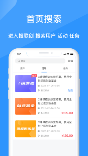 搜联创app,发现最新活动,学习更多课程,在线学知识,提升个人能力,各种活动任务尽在其中,在线接单,轻松推广,为用户带来更便捷的推广服务。