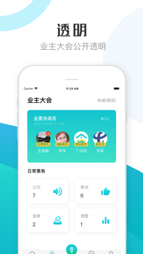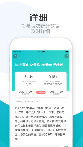 小区大小事情表决,选聘物业公司、成立业委会、物业专项维修资金等业主大会民事民意收集和表决,物业服务评价问卷调查等功能。