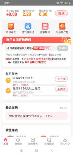 2、平台内主要有游戏赚和搜索赚钱两种方式,游戏赚任务多、奖励高,搜索任务操作简单、完成快