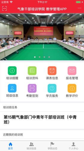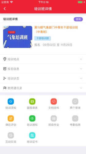 气象系统学员可以通过APP查看近期培训班、面授课表、签到、课后即评及参与教学质量调查等。