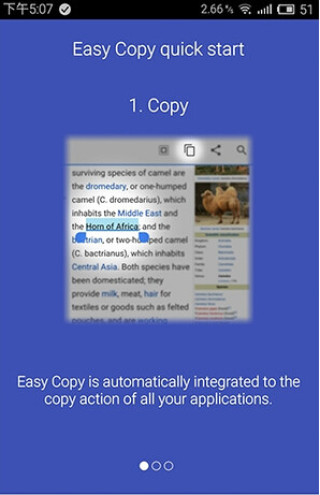 Easy copy(快速拷贝)是一款非常方便快捷的小工具,小巧的体积让它在应用中的反应速度非常之快,能够为任何应用中复制的文本弹出分享界面,轻松将文本一键复制,到其他地方。