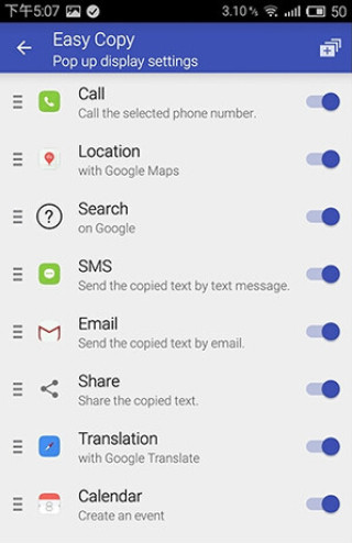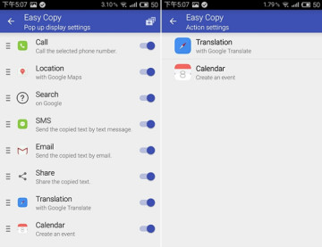 既然是小工具,那当然是非常轻量的,Easy copy 也不例外,小巧的体积让它在应用中的反应速度非常之快。使用之前我们可以对它进行一些简单的设置——点击应用图标进入设置界面,Pop up 中可以设置想要分享的平台和一些常用的 action,除此之外,它还有两个特色的功能,那就是能利用谷歌翻译功能直接翻译出复制的文字,和跟踪自带的日历创建提醒事件。搞清楚基本设置之后,我们便能愉快地在应用中自由完成复制与分享啦 。
