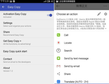 Easy copy 的界面为全英文显示,不过这并不影响日常使用,通常情况下通过图标就能快速找到所需功能。Easy Copy 除了可以自定义添加分享到目标应用外,还支持添加黑名单功能,这个功能启用之后就可以让其不弹出分享界面了。另外它的特色功能虽然十分方便易用,但是国内网络环境下 Google 服务无法正常使用,所以对于国内用户仍旧略显鸡肋。