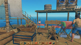 在木筏上使用钩子来收集海域上漂流的物资,不断地累积原材料;