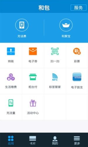 用户开通和包业务,即享线上便捷支付(互联网购物、充话费、生活缴费等);持NFC手机(更换了NFC-SIM卡)的用户,更可享和包刷卡功能,实现特约商家(便利店、商场、公交、地铁等)线下消费。