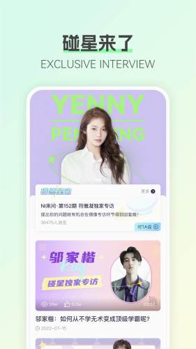 4、专访:原创特色专访栏目《碰星来了》好玩有趣的明星问答,又皮又劲爆的明星神回复,带你碰见最真实的偶像。《碰星来了》每周在碰星发布多档明星专访视频,为粉丝带来持续不断的高品质原创内容盛宴。