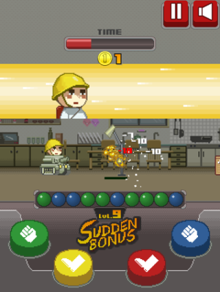 游戏的操作方式很有意思,屏幕下方有4个不同颜色的攻击按钮,而正中间的那个小小的类似于红绿灯的东西,就是告诉我们应该按那些颜色攻击按钮的提示区域。例如:中间显示的是蓝绿,那么我们只要按照提示依次按下蓝色的拳头按钮和绿色的拳头按钮,就可以快速破坏当前目标,而不用依赖初期比较低的攻击力去一下下慢慢磨血。这是游戏的核心系统,也就是让玩家按照提示来迅速而正确地进行按键操作。