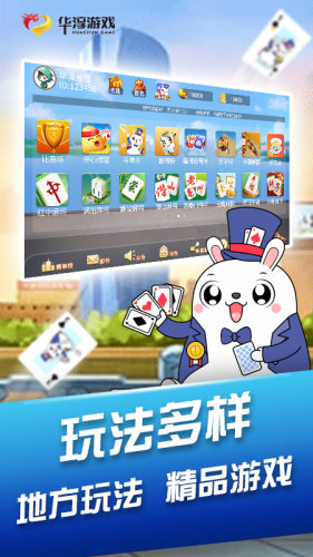 包含红中麻将、安徽地方麻将、比赛场、开心比鸡、斗地主等的经典玩法。