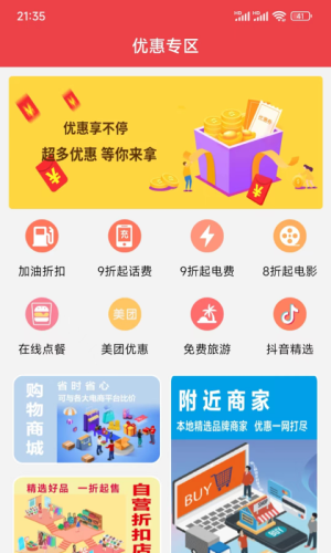 聚合了折扣加油、电费话费充值优惠、线下实体店优惠、优惠旅游、多平台购物优惠等众多资源接口,做到真正为消费者省钱,为商家引流消费双。