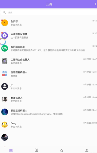 云湖app,即时聊天通讯,轻松沟通交流,与小伙伴在线沟通,即时通讯,聊天交友更轻松,软件还支持自动回复机器人、二维码生成机器人等工具,让聊天更轻松。
