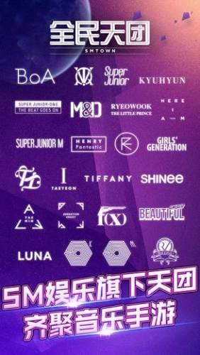 《全民天团》是款集合韩国SM娱乐旗下所有明星的休闲音乐游戏,自韩国上线以来深受粉丝追捧,被称为”最多明星手游“!