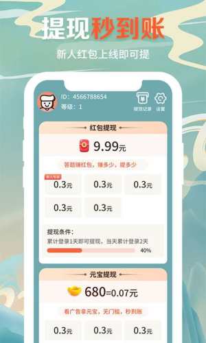 全民答题秀红包版,完全没有门槛就能答题赚钱呢,依靠自己的智慧来赚钱,看看你能答对多少,在全民答题秀红包版中都是百科常识,难度并不高,不管是大人还是小孩都可以来玩。