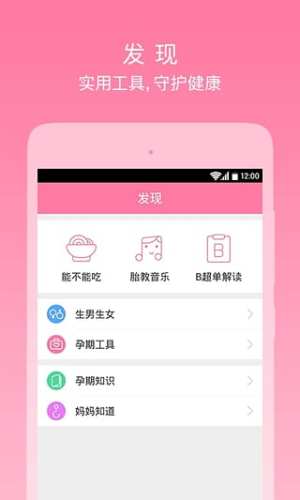 计算预产期、能不能吃、教你看懂B超单、宝宝体重计算器、宝宝发育参考、宝宝血型计算器、孕妇体重指南、唐氏筛查看男女,各种孕期工具让你全面了解宝宝发育情况。