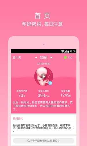 便捷记录孕期体征,实时关注宝宝最新动态,更有贴心的产检预览、记录、提醒功能,不用担心错过预约产检时间;