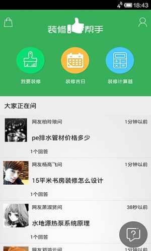 1、装修问答。随时随地提问,三分钟给你最专业的答案; 提问完后,精确推荐相关问题; 根据关键字,精确搜索答案。
