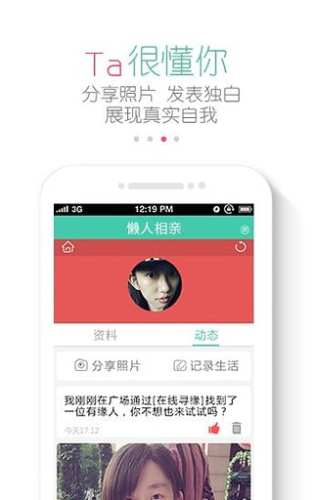 工作太忙没时间认识新朋友?生活太累没精力去谈恋爱?打开“懒人相亲”,开始一段都市“轻恋爱”!这里有最全最多的相亲对象,这里有最IN、最Cool的搭讪方式,单身进去,成对出去