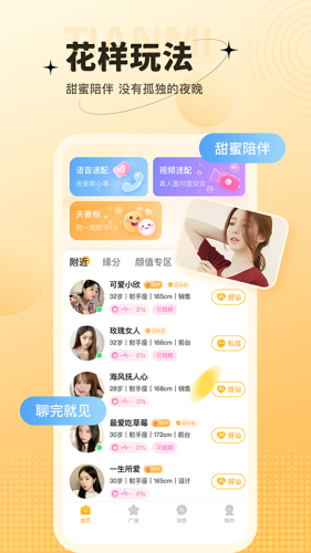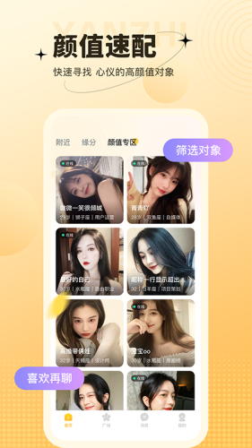 2、花样玩法语音视频速配:一键呼应,1秒速配附近人单身异性闪电互动,高颜值零距离社交,有颜有色秀出魅力,喜欢就直接视频告白俘获ta的芳心;