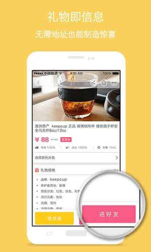 [送好友]全新的送礼物体验,用户可以选完礼物后,完成付款,付款后留下祝福的文字,通过即时通信应用如:微信QQ发送给收礼人,由收礼人填写或确定收货信息,而且收礼人的收货信息对送礼人是完全保密的,这样不到一分钟就完成了线上送礼物。