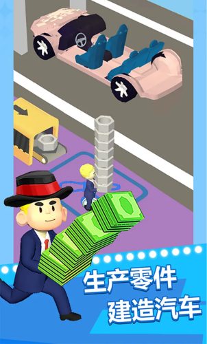 富翁X富翁是一款模拟工厂,多个车间,多条生产线生产不同的东西销售。产品有玩具,运动用品,汽车等。每个生产线有不同的工人,工人会偷懒睡觉,需要玩家互动提醒叫醒,也可以雇佣监工帮忙叫醒。也有搬运工人,一起搬运卖货,配备搬运工人道具,提高卖货效率。