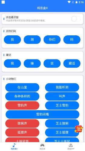 纯音盒x是款十分有趣的魔性语音盒,各种趣味的语音任你选择,自带悬浮窗口,各种游戏一键使用,魔性的声音回荡在你的耳边,体验快乐的源泉,感兴趣的小伙伴快来点击下载吧!