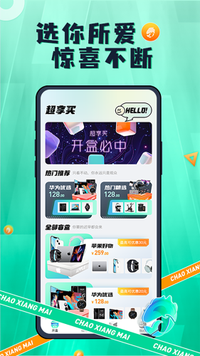 超享买app,汇聚大量潮玩好物,商品多多,品类齐全,一键开箱,获取更多潮流好物,轻松兑换超值好物,更多惊喜福利等你来。超享买app,在线抽盲盒,各种潮流商品尽在其中。